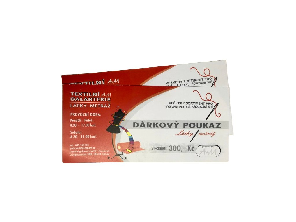 Poukázka platí pro kamennou prodejnu Textilní galanterie A+M Zdeněk Dundáček - látky a metráž, Moukova 1994/1 Tišnov, budova Noemi. Platnost poukázky je do 31.12.2026.
