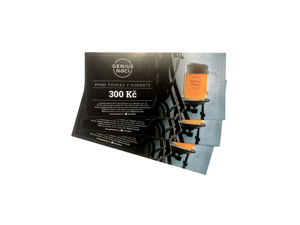 Poukázka je v hodnotě 300 Kč a lze ji použít na nákup čepovaného nebo lahvovaného piva v pivnici Genius Noci, Palackého nám. 30, 679 23 Lomnice, v otevírací době pátek 17:00-22:00 a sobota, neděle 14:00-22:00. Aktuálně o otevírací době viz též aktuální informace na Facebooku, v lednu a únoru může být zavřeno. Platnost poukazu do 30.6.2026.