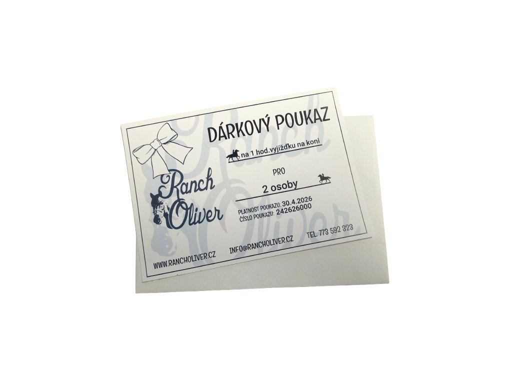 Dárková poukázka na Ranch Oliver v Kuřimi na hodinovou vyjížďku na koni pro 2 osoby pro nejkrásnější pohled na svět z koňského hřbetu. Poukázka má hodnotu 920 Kč a lze ji uplatnit na Ranchi Oliver v Kuřimi do 30.4.2026.